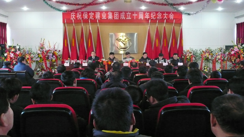 2008年12月18日上午8時28分,慶祝保定建業集團成立十周年紀念大會在集團公司六樓大會議室隆重召開,參加大會的有市建設局有關領導、市總工會有關領導、兄弟單位領導、集團領導及集團公司有關人員共計200余人,共有60多家單位給本次大會的召開發來了賀信,大會在隆重的國歌聲中開幕。